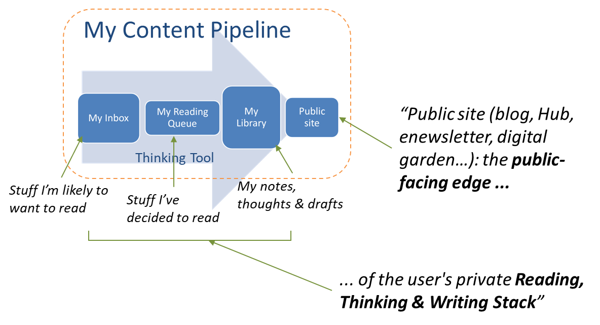 The thinking tool basically spans the "Reading Queue -> My Library" stages in the middle of the user's "reading, thinking, writing & publishing stack":